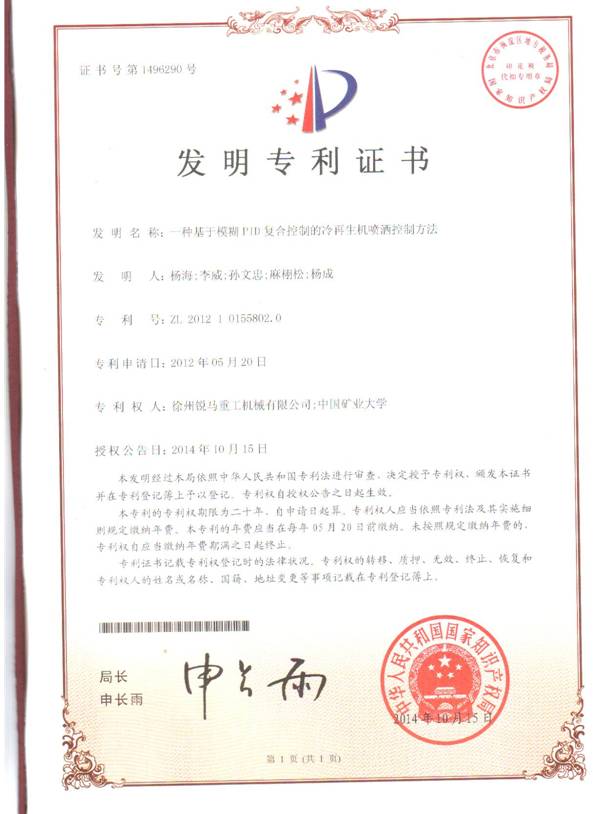 新獲國家批準(zhǔn)的專利名稱為:一種基于模湖PID復(fù)合控制的冷再生機(jī)噴灑控制方法,該發(fā)明專利由我公司與中國礦業(yè)大學(xué)聯(lián)合開發(fā),專利權(quán)由雙方共有。該項(xiàng)專利早已在我公司生產(chǎn)的路面冷再生機(jī)上獲得應(yīng)用。路面冷再生機(jī)的添加劑噴灑控制系統(tǒng)的**與穩(wěn)定對(duì)冷再生施工質(zhì)量有著決定性的影響,對(duì)于有經(jīng)驗(yàn)的路面冷再生行業(yè)人士來說是深有體會(huì)。我公司冷再生機(jī)噴水系統(tǒng)具有計(jì)量準(zhǔn)確,流量穩(wěn)定的特點(diǎn),深受廣大用戶的好評(píng),這是我公司堅(jiān)持走技術(shù)創(chuàng)新,掌握了核心技術(shù)的結(jié)果。得益于持續(xù)不斷的技術(shù)創(chuàng)新,我公司冷再生機(jī)產(chǎn)品在技術(shù)水平上已處于國內(nèi)領(lǐng)先地位,產(chǎn)品銷量也迭創(chuàng)新高,同樣國內(nèi)領(lǐng)先。堅(jiān)持技術(shù)創(chuàng)新,保持產(chǎn)品性能優(yōu)勢(shì)是徐州銳馬重工一貫的宗旨,與進(jìn)口機(jī)械一爭(zhēng)高下,促進(jìn)國內(nèi)路面冷再生事業(yè)的健康發(fā)展是徐州銳馬重工不變的目標(biāo)。