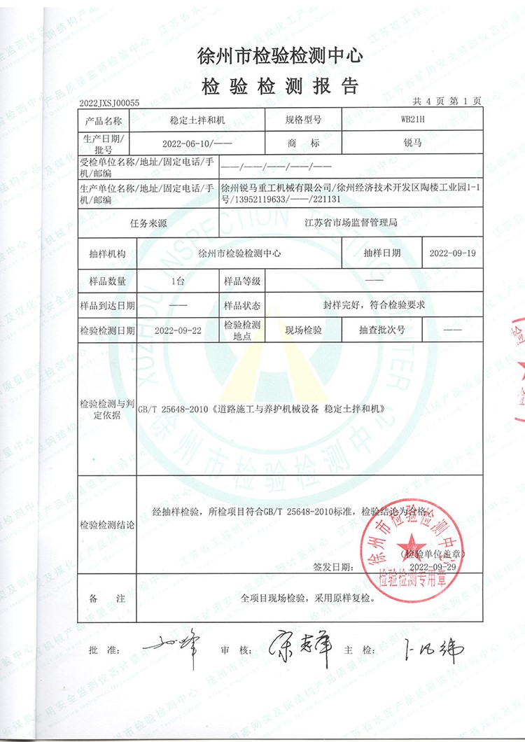 受江蘇省市場監(jiān)督管理局委托,徐州市檢驗檢測中心近期對我公司產(chǎn)品穩(wěn)定土拌和機做了整機檢測。